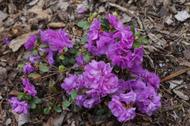 The related plants that grow farther north regularly drop their leaves in the fall and are called Rhododendron mucronulatum, though the two interbreed very easily in culture. Perhaps you have heard of R. mucronulatum ‘Cornell Pink’, which makes a spectacular show of sugar-pink flowers on a large plant bare of leaves, though the usual color of the species is lavender to magenta.