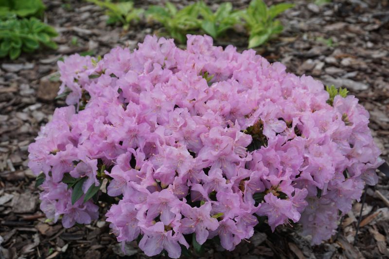 Mountaintops are cool, windy, and sunny with rocky, well-drained soil. The rhododendrons that naturally thrive there have small leaves on densely twiggy branches. They blossom early and hunker down in the shelter of rocks. North-facing slopes offer snow cover for evergreen rhododendrons but those that lose their leaves in winter or have small, thyme-like leaves can grow in full sun. That sun tolerance makes them suitable for rock gardens placed in sun. They are all scaly-leaved types, also called small leaved or lepidotes, and evolved growing in sun. Rhododendron ‘PJM’, though too large for most rock gardens, is a lepidote and blooms best in sun. Large-leaved types of rhododendrons grow at lower elevations or are woodlanders, needing partial shade, especially where summers are hot.