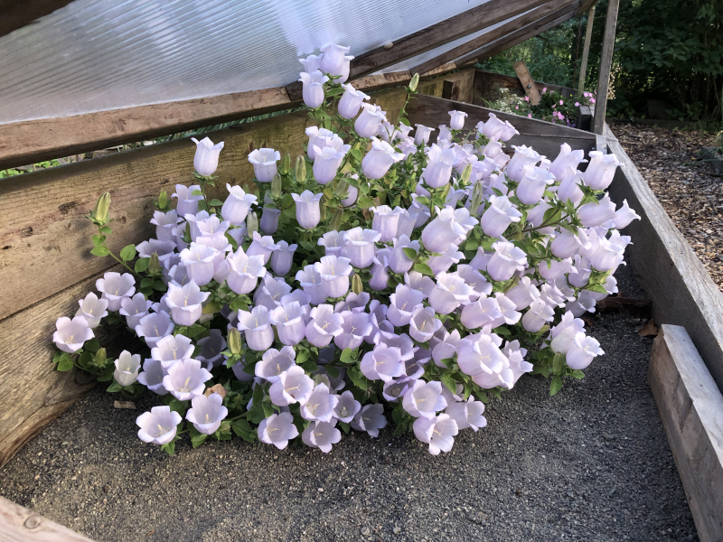 Campanula incurva takes three years to bloom (and dies after it does) but the floral display is truly over the top. My happiest plants were grown in pots sunk in the covered, sand-filled cold frame. After two years as rosettes, they erupted into mounds with hundreds of large, pale blue bells. This species is regularly available in the seed exchange.