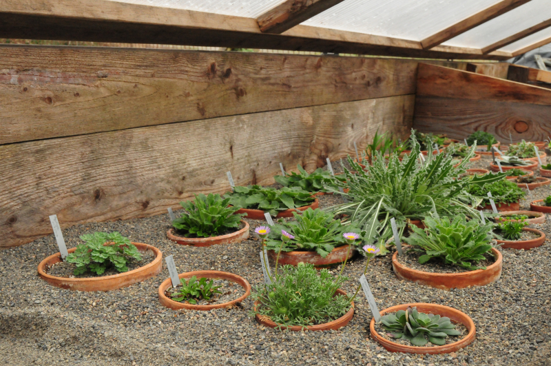 As it happened, my former employers had just sold the green roof nursery and were looking for a way to unload several large “Super Saks” of green roof media. This blend of expanded shale and compost was the perfect base for the new rock garden. Faced with a patch of lawn approximately 30 by 30 feet (9m x 9m), I drew a rough blueprint with a curved path moving through the square at a diagonal. The bones of the two resulting beds were formed from boulders that had been excavated from our rocky fields over the years. I directed the placement and Dad nudged them into place with a skid steer. The beds are simple mounds of fill covered with expanded shale medium and dotted with rocks – “plum puddings” à la Farrer, though I use the term affectionately! Smaller rocks are piled and stacked along the edges, forming a loose stone wall. In year two, I added another bed along the west side, filling it with the last of the green roof medium. In 2020, the rock garden crept further west with the addition of a sand-filled cold frame built by my dad. It is a wooden structure with a polycarbonate lid that can be propped up in warm weather. It holds about two tons of builder’s sand obtained from a neighbor’s sand and gravel pit. It has proven very useful for overwintering plants that are on the edge of hardiness and/or dislike winter wet. I sink terracotta pots in one half and plant directly in the other. The latest addition to the rock garden has been an assortment of homemade hypertufa troughs. They are displayed at the edge of the rock garden in summer and overwintered in an unheated greenhouse.