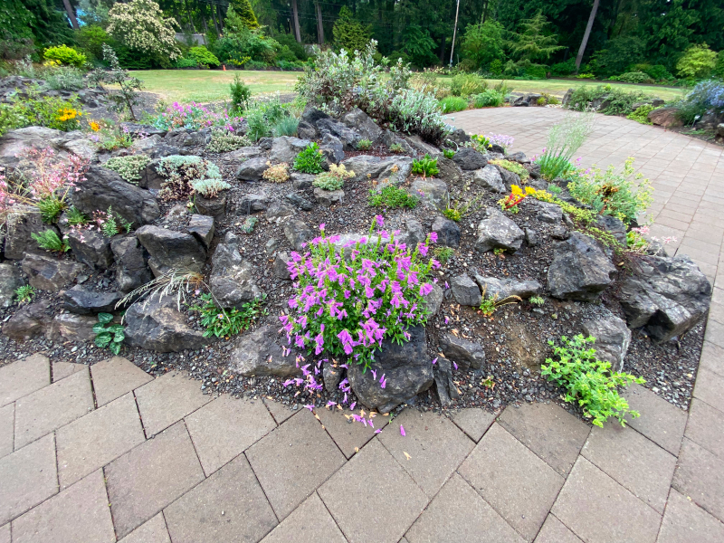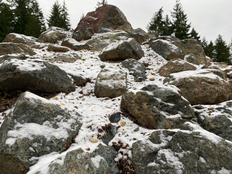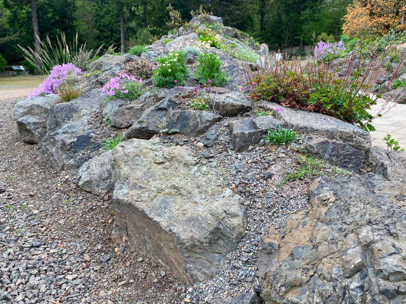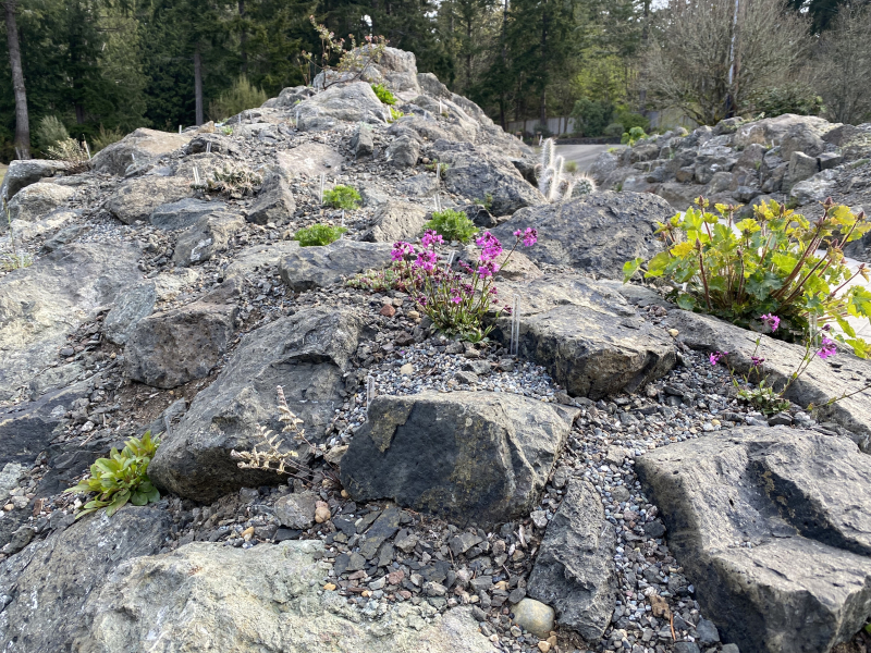 Heronswood is not known for rock gardening. This 15-acre botanical garden on the Kitsap Peninsula in western Washington State is more often associated with the activities of its founder, the plantsman Dan Hinkley, and the far-flung plant menagerie he built through numerous expeditions around the world. Much of the Heronswood campus is covered in a native tree canopy – Douglas fir, grand fir, western red cedar, and hemlock – creating a cool, shady environment in which Dan’s collections of hydrangeas, mahonias, woodland lilies, and ferns thrive. Not an obvious location for a rock garden! And yet, in the winter of 2020/21, a rock garden began to emerge in a corner of the Heronswood parking lot.