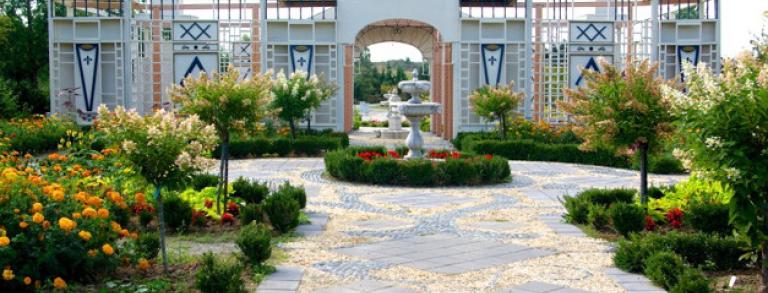 The Temple Garden has a classical design with the use of circles and squares. A wrought iron dome, on pillars 10 feet (3 m) high is surrounded by four fountains. There are floral displays and statues completing this garden.