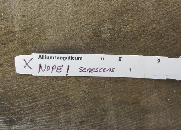 Allium tanguticum is not in cultivation! Yet, many nurseries selling Allium plants sell something labeled as Allium tanguticum. Allium tanguticum is a bulbous species (not rhizomatous) with leaves 1-3 mm (quite narrow), and purplish flowers. The requisite imposter is always the same thing, a poor pallid form of Allium senescens ssp. montanum, with strong Iris-like rhizomes and twisting shiny green leaves about 1 cm wide. Not sure why such an obvious misnomer is so persistent, but it is, perhaps perpetuated by the fact large bulb companies such as McClure and Zimmerman persist in such sales and refuse to listen to any correction.