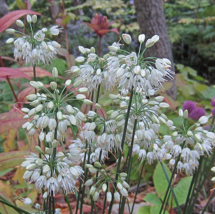 My favorite is a robust white form of Allium thunbergii that I find to be a particularly good garden plant, growing about 14"-16" tall. It is stronger growing than some other white forms I have tried.  In one photo, you'll see Allium sacculiferum in the background, for size comparison.