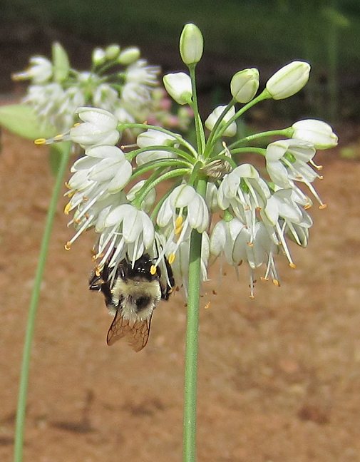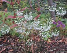 My favorite is a robust white form of Allium thunbergii that I find to be a particularly good garden plant, growing about 14"-16" tall. It is stronger growing than some other white forms I have tried. In one photo, you'll see Allium sacculiferum in the background, for size comparison.