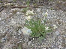 I have to say that I was a bit surprised (shocked?, affronted?, even disappointed?... ) to see some of the plants that I consider "alpine" growing at relatively low elevation in the scree along the roadside, where the rock cilffs rise out of the Spray Lakes reservoir! (Obviously, that's my problem of perception, not that of the plants!) It was excellent that my sister, a nonhiker, could see a few of them, thusly, but I will continue to prefer to see them in their "usual" alpine situations, for as long as I'm physically able, where they are unsullied by road dust (and away from the company of the cretins who spray paint inanities on the rock faces). Anyway...
