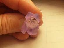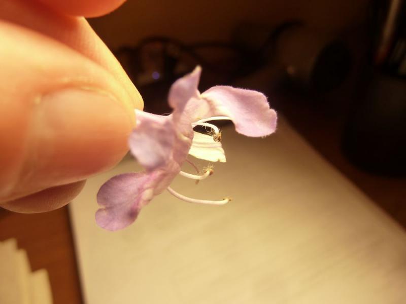 Anthers are exerted (they extend past the flower tube, and are visible when the flower is held in side view, bottom of photo); corolla up to 4 cm (these measure 4 cm):