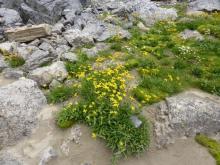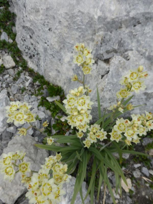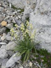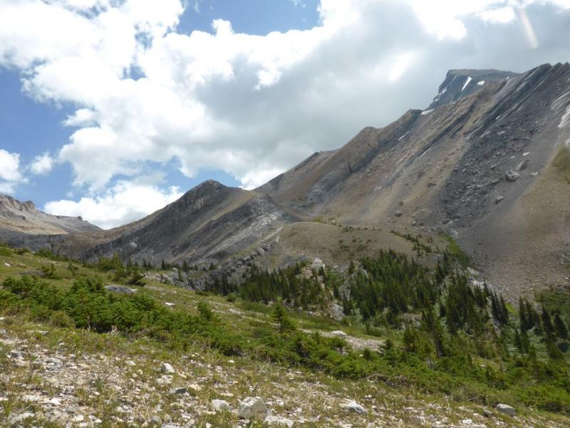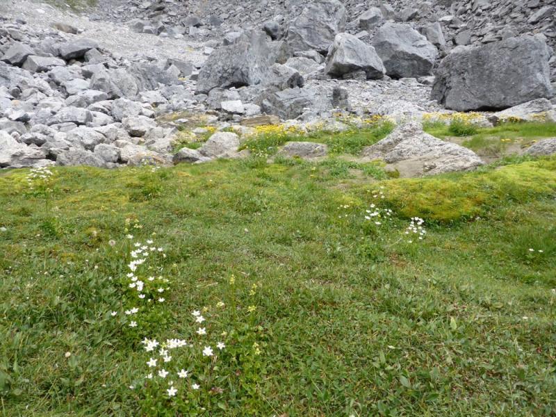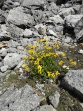 Up and up a steep slope through more talus (our chosen route to get past, actually around, the second headwall)... and tucked in here and there, some plant life: Hooker's Thistle, Cirsium hookerianum; grass-of-parnassus, Parnassia fimbriata, and Arnica sp.;