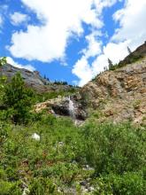A steep upwards climb on rough "trail", through a boulder-filled drainage and past a scenic waterfall:
