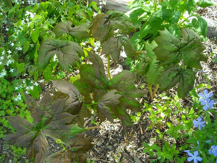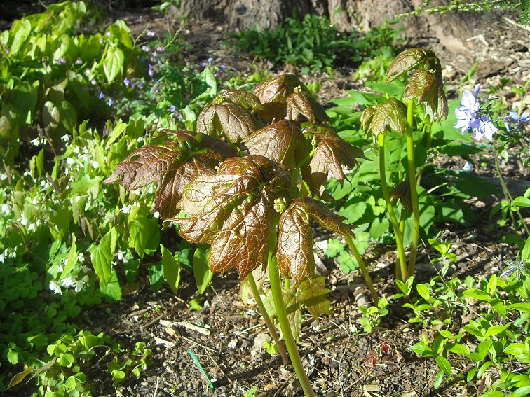 This plant has been very slow to establish, taking a decade to bulk up into a fine clump, probably because I have it in somewhat dry shade, when the plant prefers more moist conditions. But it never fails to provide a long season of foliar interest, if not amusingly so, as the leaves are indeed like crinkly brown umbrellas when they first emerge, the brown and green mottling lasting for weeks as the leaves expand. The single leaves are large, and reminiscent of Jeffersonia (Twin Leaf) with the mass of each leaf divided into two opposing sides, like big crazy neckties.
