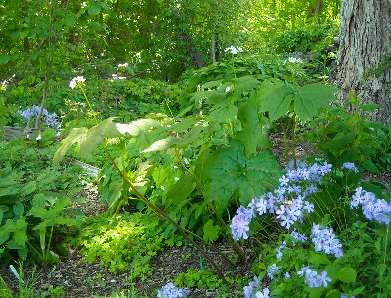 An excellent woodlander from Southeastern USA, but perfectly hardy in northern New England, is the Umbrella Leaf of Diphylleia cymosa, a member of the Berberidaceae. It's another of those classic examples of a small genus with one species found in Southeastern USA, and with one or two counterpart species found in Asia.