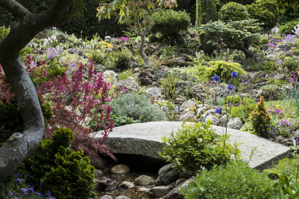 In a rock garden, however small, it is okay to have some trees as long as they do not get too big. In Shirley’s garden a beautiful Aesculus pavia 'Koehnei', also known as dwarf horse chestnut, has a prominent place on one of the rocky hills and there are also several dwarf conifers, some of which Shirley bought in the Czech Republic in the last century. Pruning them regularly in such a way that they retain their natural shape will keep them small and allow them to be a beautiful part of the garden for years to come.