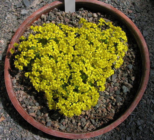 Draba polytricha is a low (5 cm) bun-forming alpine with tiny rosettes of fuzzy, grey-green foliage and numerous thin stems topped with small clusters of yellow flowers. This species is native to the alpine regions of Turkey. It is considered hardy from zones 5 through 7.